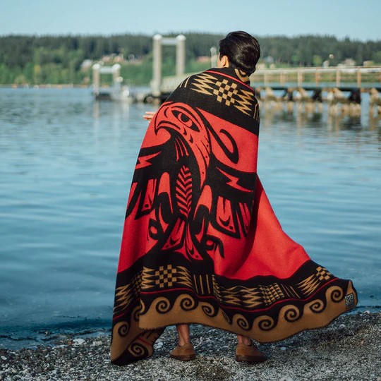 The "Thunderbird Arrives" blanket was created to commemorate the Evergreen Longhouse's 20th Anniversary. The design was developed collaboratively by Louie Gong (Nooksack) and a team of staff and artists representing the Longhouse Education and Cultural Center. It features a bold Thunderbird, bordered by patterns representing the Coast Salish and Maori communities with whom the Longhouse maintains close ties. It is the first wool blanket ever created by a Native-owned company. Eighth Generation is a Seattle-based lifestyle brand proudly owned by the Snoqualmie Tribe. Their goal is to build capacity among cultural artists while addressing the economic impact of cultural appropriation.